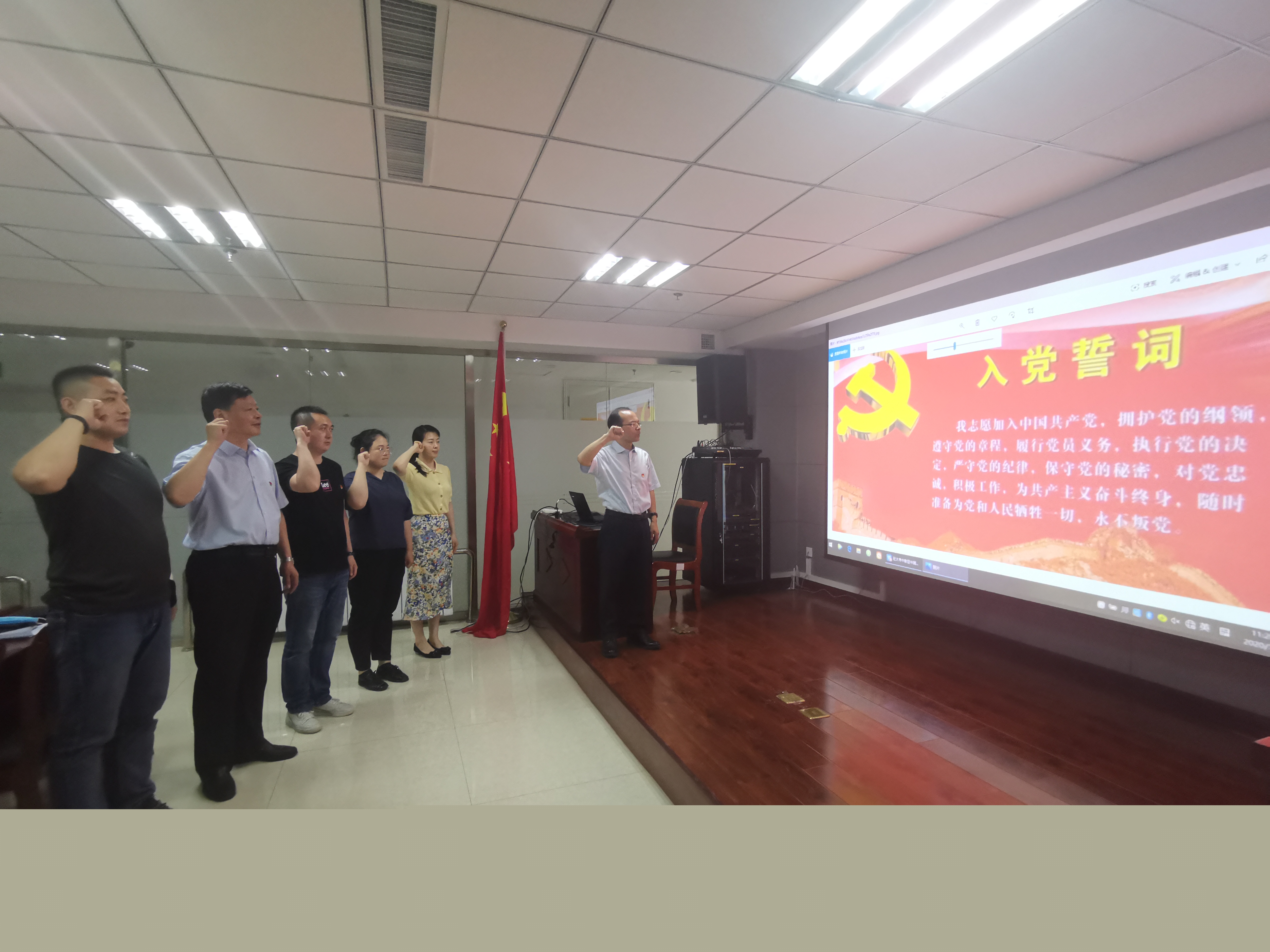 由黨支部書記焦俊良同志領(lǐng)誓,全體黨員面對鮮紅的黨旗,舉起右拳,莊嚴宣誓?!拔倚模何抑驹讣尤胫袊伯a(chǎn)黨,擁護黨的綱領(lǐng),遵守黨的章程,履行黨員義務(wù),執(zhí)行黨的決定,嚴守黨的紀律,保守黨的秘密,對黨忠誠,積極工作,為共產(chǎn)主義奮斗終身,隨時準備為黨和人民犧牲一切,永不叛黨?!辩H鏘有力的誓言,讓每名黨員受到了一次深刻的黨性教育和政治靈魂洗禮。