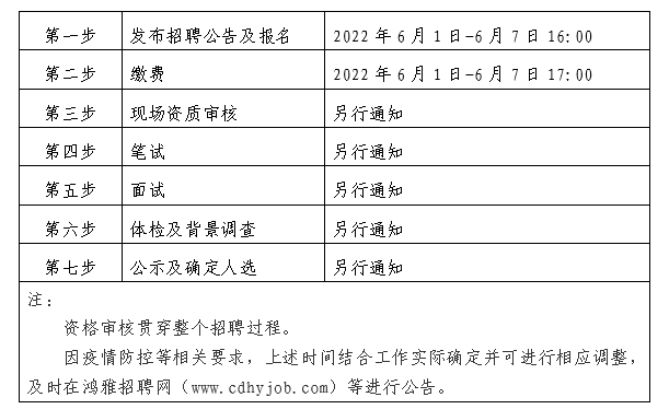 2022年6月1日至2022年6月7日16:00 在鴻雅招聘網(wǎng)(http://www.cdhyjob.com/)、鴻雅微信公眾號、國控集團官方網(wǎng)站(http://www.zhayg.com/)及上級部門要求的相關(guān)網(wǎng)站等發(fā)布招聘公告。