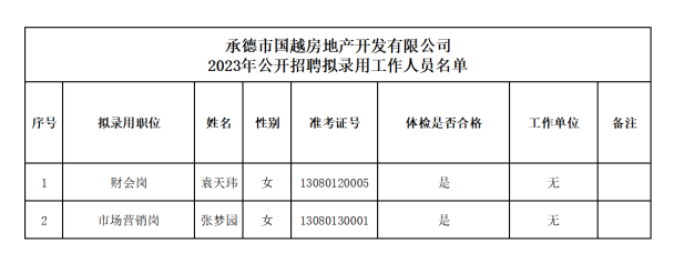 根據(jù)2023年度承德市國(guó)越房地產(chǎn)開(kāi)發(fā)有限公司公開(kāi)招聘工作人員的相關(guān)要求,經(jīng)過(guò)筆試、面試、體檢和考察等程序,確定袁天瑋、張夢(mèng)園2名同志為承德市國(guó)越房地產(chǎn)開(kāi)發(fā)有限公司擬錄用工作人員,現(xiàn)予以公示。公示期間如有異議,可通過(guò)電話、信函等方式反映,反映意見(jiàn)請(qǐng)署真實(shí)姓名。