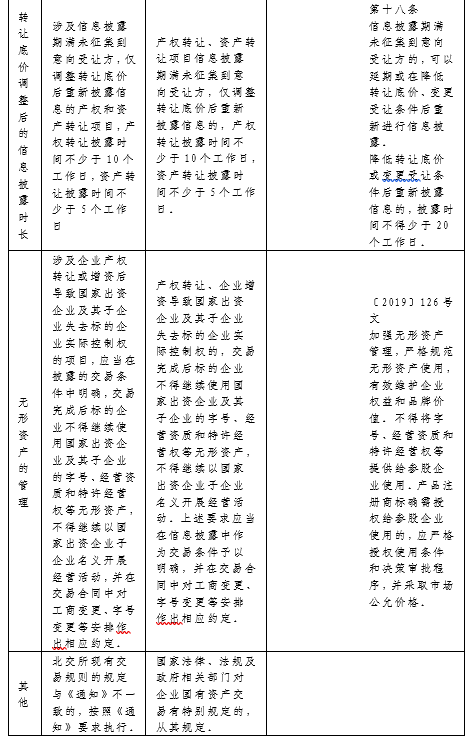 八、產(chǎn)權(quán)轉(zhuǎn)讓、資產(chǎn)轉(zhuǎn)讓項(xiàng)目信息披露期滿(mǎn)未征集到意向受讓方,僅調(diào)整轉(zhuǎn)讓底價(jià)后重新披露信息的,產(chǎn)權(quán)轉(zhuǎn)讓披露時(shí)間不少于10個(gè)工作日,資產(chǎn)轉(zhuǎn)讓披露時(shí)間不少于5個(gè)工作日。(與32號(hào)文相應(yīng)規(guī)定相比,縮短了信息披露的時(shí)間,提升了效率)